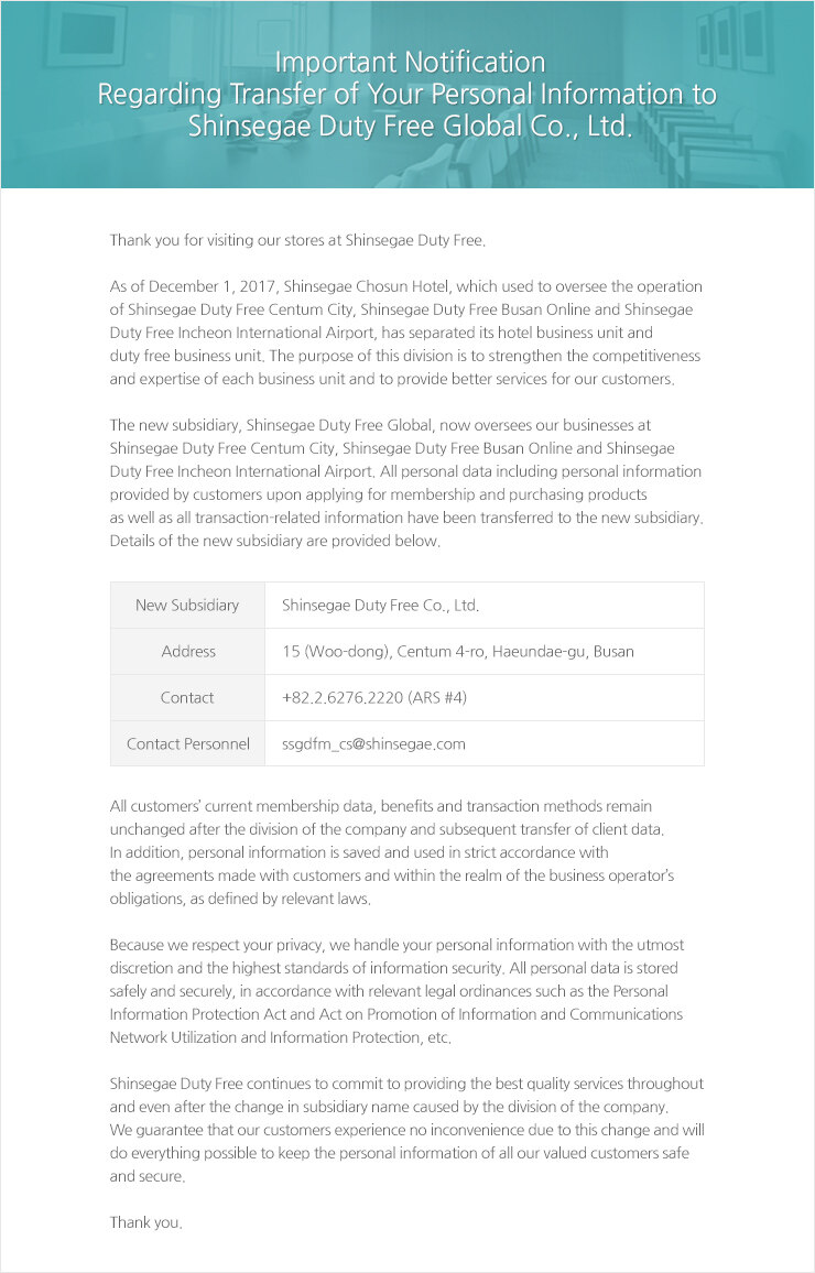 Transfer of Your Personal Information to Shinsegae Duty Free Global Co., Ltd.