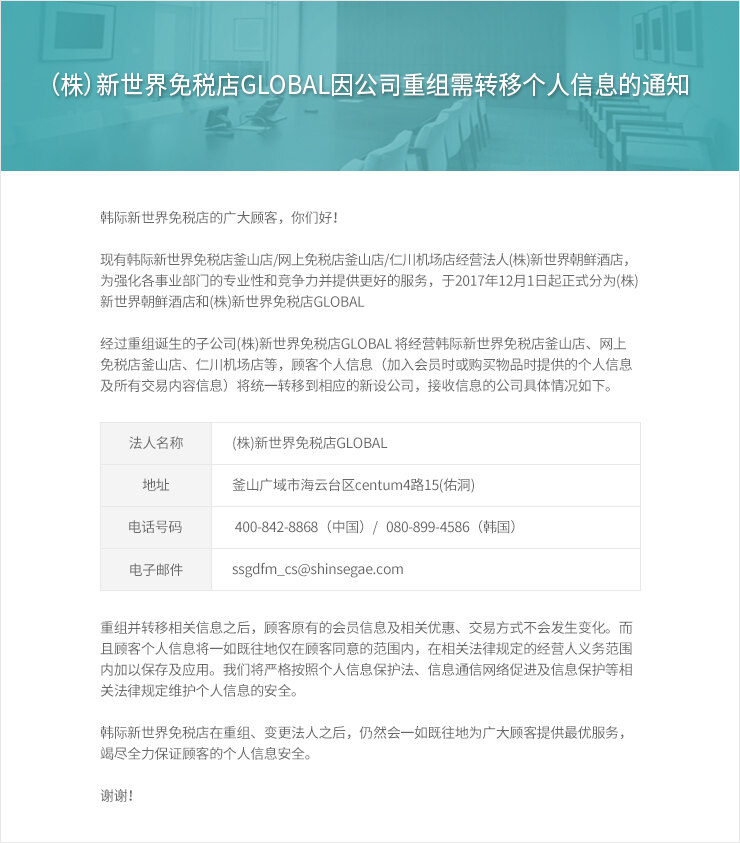 (株)新世界免税店GLOBAL因公司重组需转移个人信息的通知