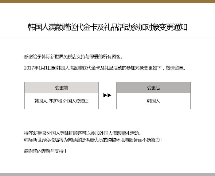 韩国人满额赠送代金卡及礼品活动参加对象变更通知