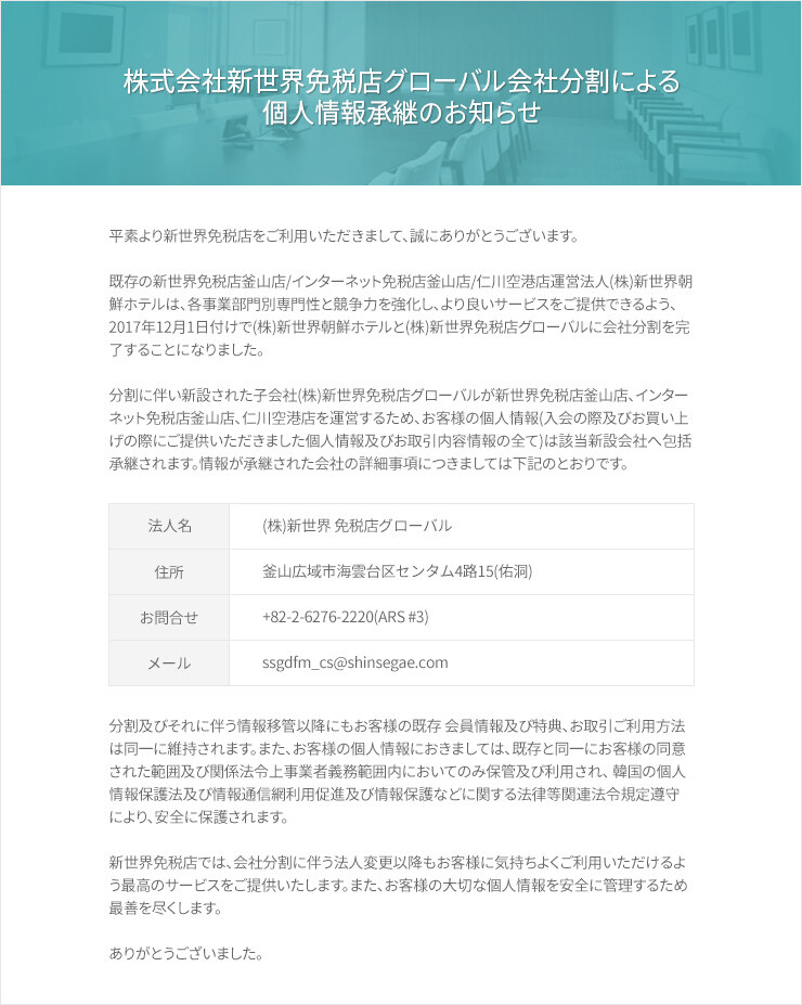 株式会社新世界免税店グローバル会社分割による個人情報承継のお知らせ